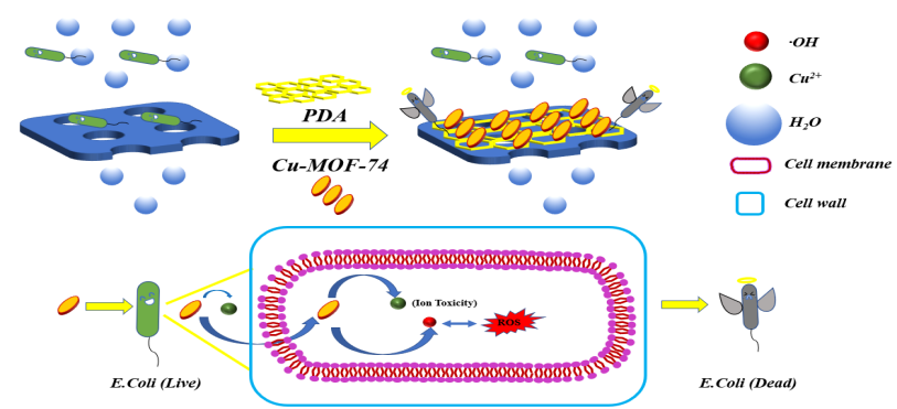 膜分离技术现已广泛应用于环保、生物制药、水处理等领域。然而,在实际运行中,膜的膜污染问题始终是限制其发展的瓶颈问题,膜污染的累积会造成工艺的不稳定,增加了运行的维护管理成本,影响水生产的经济性和安全性。现有的缓解膜污染的方法存在工艺复杂,膜改性材料不稳定等问题。本研究以醋酸铜和2,5-二羟基对苯二甲酸分别作为金属离子供体及羧酸配体,利用环境友好的方法在常温常压条件下制备了Cu-MOF-74,利用聚多巴胺作为辅助粘结剂对PVDF膜表面进行表面改性;改性后膜表面具有较强的疏水性,持续稳定释放的Cu2 +能有效杀死膜表面截留细菌,膜的抗菌效率高达97.7%。此外,研究还发现这种Cu-MOF-74能够释放·OH,从而导致细菌细胞中活性氧(ROS)的积累,有利于提高膜的抗生物污染性能。本研究对于有效缓解膜污染,促进膜技术的开发及水处理技术研究提供了新的思路及理论依据。